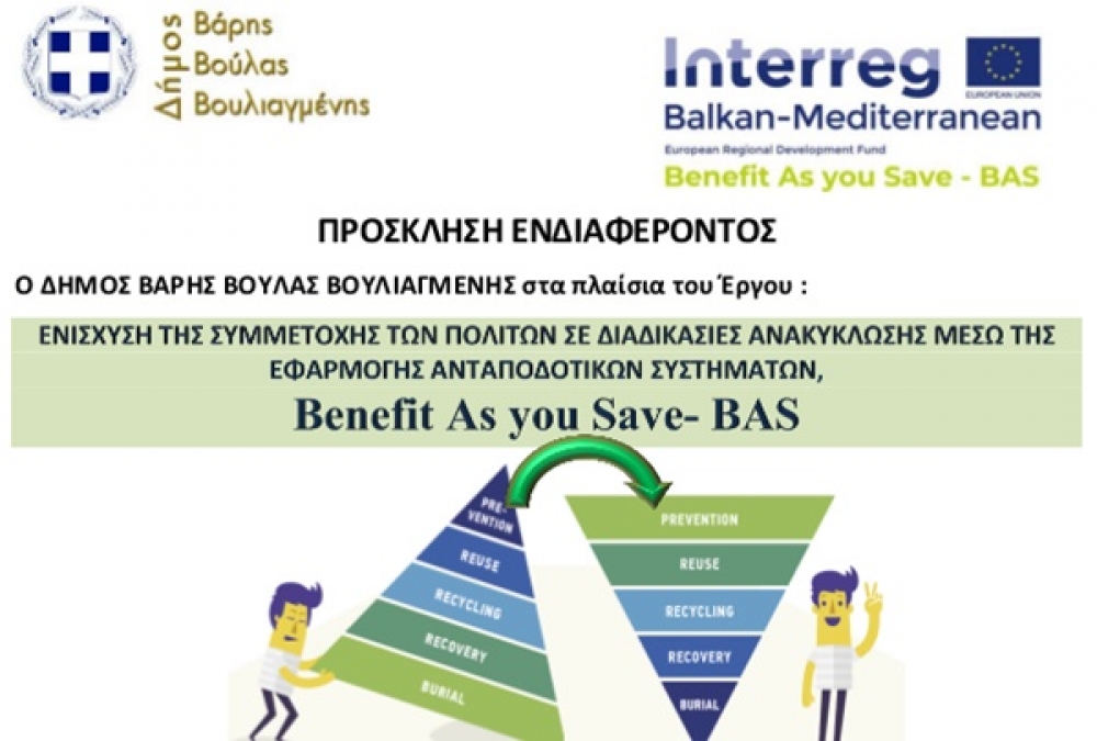 Σεμινάρια με θέμα: «Διαλογή στην Πηγή στην κατεύθυνση μιας κοινωνίας μηδενικών αποβλήτων» διοργανώνει ο Δήμος Βάρης Βούλας Βουλιαγμένης. Τα τμήματα ξεκινούν τη Δευτέρα 19 Δεκεμβρίου και πραγματοποιούνται στο πλαίσιο του διακρατικού έργου «Ενίσχυση της συμμετοχής των πολιτών σε διαδικασίες ανακύκλωσης μέσω της εφαρμογής ανταποδοτικών συστημάτων – Benefit As you Save – BAS» στο οποίο επικεφαλής εταίρος είναι ο Δήμος Βάρης Βούλας Βουλιαγμένης.