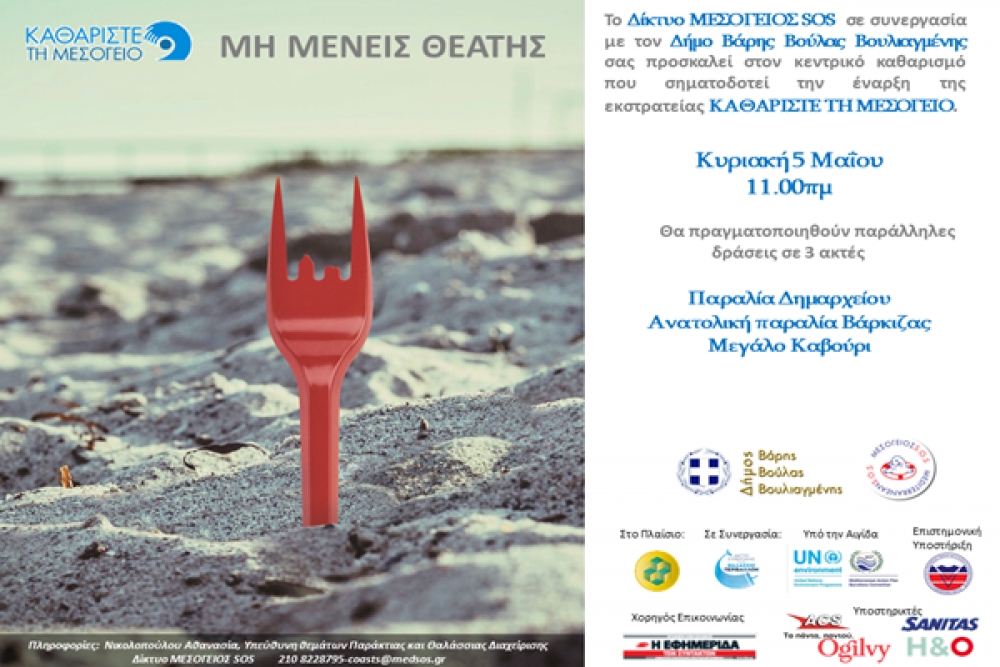 Ο κεντρικός καθαρισμός του Δικτύου ΜΕΣΟΓΕΙΟΣ SOS θα πραγματοποιηθεί την Κυριακή 05 Μαΐου και ώρα 11:00π.μ., σε τρεις ακτές του Δήμου Βάρης Βούλας Βουλιαγμένης: στην παραλία Δημαρχείου, την Ανατολική παραλία Βάρκιζας και το Μεγάλο Καβούρι.