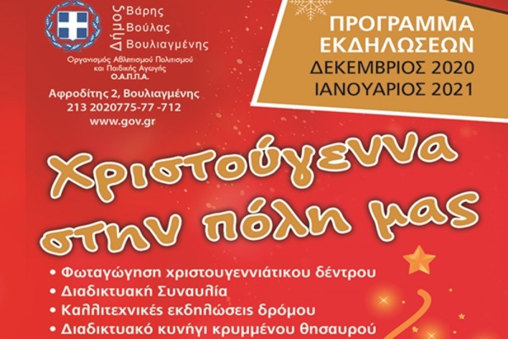 Ένα πρωτοποριακό και φαντασμαγορικό εορταστικό πρόγραμμα, το οποίο φέτος, λόγω των ιδιαίτερων υγειονομικών συνθηκών, θα το παρακολουθήσουμε από την ασφάλεια και τη θαλπωρή του σπιτιού μας έχει οργανώσει ο Οργανισμός Αθλητισμού Πολιτισμού και Παιδικής Αγωγής του Δήμου Βάρης Βούλας Βουλιαγμένης, θέλοντας να φέρει σε κάθε σπίτι τη χαρά και την μαγεία της Χριστουγεννιάτικης γιορτής.