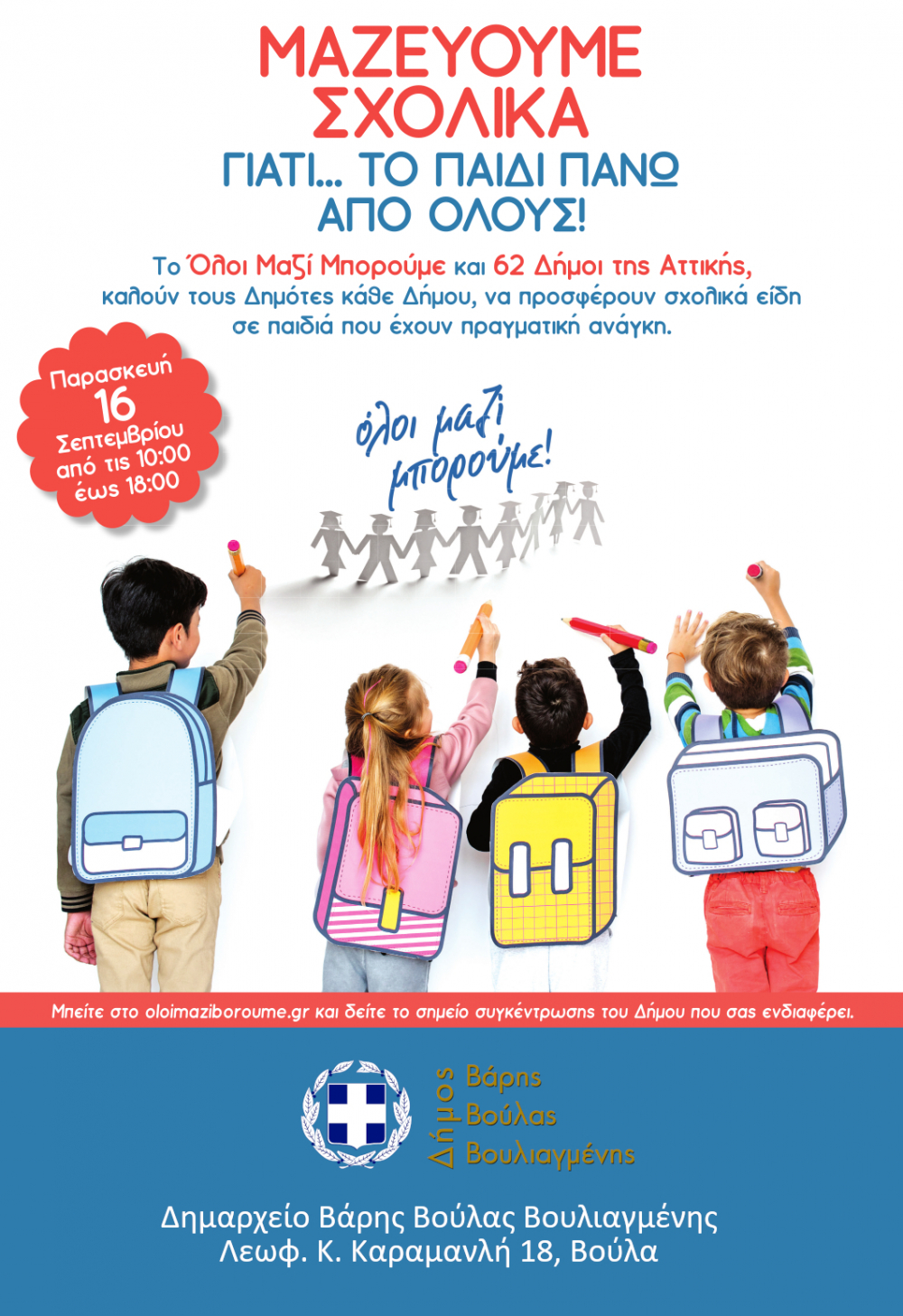 Ο Δήμος Βάρης Βούλας Βουλιαγμένης σε συνεργασία με το ΟΛΟΙ ΜΑΖΙ ΜΠΟΡΟΥΜΕ συμμετέχει στη πρωτοβουλία συγκέντρωσης σχολικών ειδών την Παρασκευή 16 Σεπτεμβρίου, από τις 10:00 έως τις 18:00, στην είσοδο του Δημαρχείου Βάρης Βούλας Βουλιαγμένης (Λεωφόρος Κ. Καραμανλή 18, Βούλα).