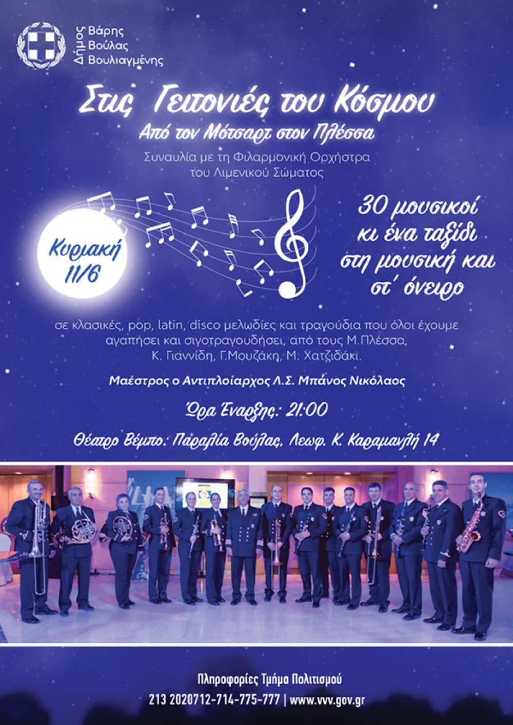 Συναυλία με τη Φιλαρμονική Ορχήστρα του Λιμενικού Σώματος διοργανώνει ο Δήμος Βάρης Βούλας Βουλιαγμένης την Κυριακή 11 Ιουνίου στις 21:00 στο Θέατρο Βέμπο στην παραλία της Βούλας (Λεωφ. Κ. Καραμανλή 14, Βούλα). Τριάντα μουσικοί, υπό την καθοδήγηση του μαέστρου Αντιπλοίαρχου Λ.Σ. Νικόλαου Μπάνου, θα μας συνοδέψουν σε ένα μουσικό ταξίδι από τον Μότσαρτ στον Πλέσσα και κλασικές, pop, latin, disco μελωδίες και τραγούδια που όλοι έχουμε αγαπήσει και σιγοτραγουδήσει.