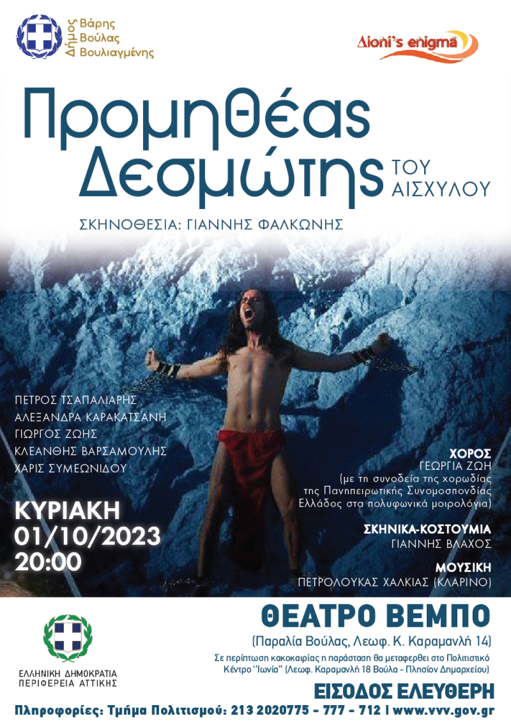 Ο Γιάννης Φαλκώνης με την παράσταση που σκηνοθετεί μας καλεί να γνωρίσουμε από κοντά τον Προμηθέα. Μελετώντας για χρόνια το αρχαίο δράμα, με απόλυτο σεβασμό στον λόγο του Αισχύλου, αναζήτησε τους κώδικες των ιερών αυτών κειμένων και αφουγκράστηκε το βαθύτερο νόημά τους καθώς διέβλεψε την διαχρονική τους συνέχεια στο λαϊκό πολιτισμό που φτάνει έως τις ημέρες μας. Για αυτό τον λόγο στην παράστασή του καίρια είναι η συνδρομή του αρχετυπικού κορυφαίου μουσικού Πετρολούκα Χαλκιά που μαζί με τον Πέτρο Χαλκιά αυτοσχεδιάζει επί σκηνής στο αρχαιοελληνικό πεντατονικό σύστημα, συνδέοντας με το κλαρίνο του άρρηκτα την εποχή του Αισχύλου και τον λόγο του, με τον σύγχρονο ελληνικό πολιτισμό και συνθέτοντας ένα ολόκληρο μουσικό σύμπαν με την συνδρομή της Γεωργίας Ζώη στα μοιρολόγια, του Παν Καπερνέκα στην αρχαία ελληνική λύρα, στα κρουστά και τους αυλούς, της Αρετής Κόκκινου στην κιθάρα και τα κρουστά και του «Πολυφωνικού της Πανηπειρωτικής» υπό τη διεύθυνση του σπουδαίου Βαγγέλη Κώτσου…