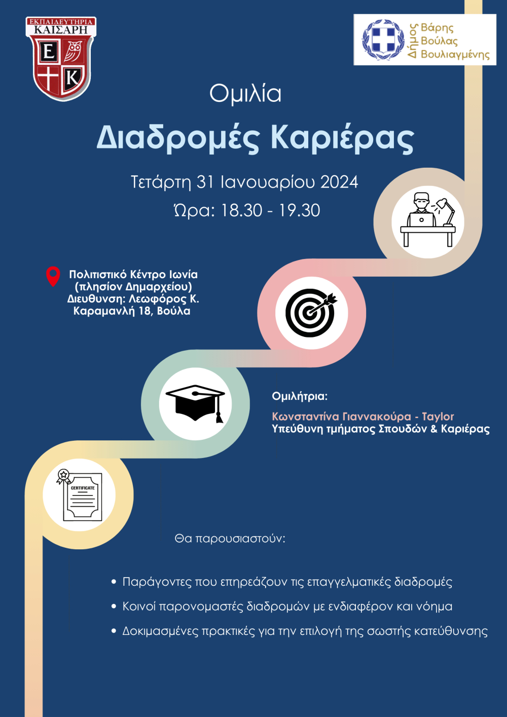 Τα Εκπαιδευτήρια Καίσαρη, υπό την αιγίδα του Δήμου Βάρης Βούλας Βουλιαγμένης, σας διοργανώνουν εκδήλωση-ομιλία με θέμα «Διαδρομές Καριέρας» την Τετάρτη 31 Ιανουαρίου στις 18.30, στο Πολιτιστικό Κέντρο Ιωνία στη Βούλα. Την ομιλία θα παραθέσει η Υπεύθυνη του Τμήματος Σπουδών και Καριέρας των εκπαιδευτηρίων Καίσαρη, κα Κωνσταντίνα Γιαννακούρα–Taylor. Η ομιλία απευθύνεται κυρίως σε γονείς και μαθητές που καλούνται να λάβουν σημαντικές αποφάσεις για το μέλλον τους και θα επικεντρωθεί μέσω παραδειγμάτων, κυρίως στους παράγοντες που επηρεάζουν τις επαγγελματικές διαδρομές, τους κοινούς παρονομαστές διαδρομών με ενδιαφέρον και νόημα και δοκιμασμένες πρακτικές για την επιλογή της σωστής κατέυθυνσης.