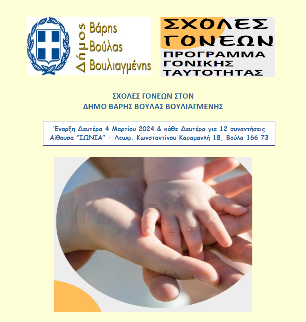 Ο Δήμος Βάρης Βούλας Βουλιαγμένης ανακοινώνει την έναρξη Σχολής Γονέων με το πρόγραμμα «Γονική Ταυτότητα» για γονείς παιδιών ηλικίας έως 7 ετών, με συντονίστρια τη ψυχολόγο, κα Σοφία Κυριακοπούλου. Στο πλαίσιο αυτής της δράσης, θα πραγματοποιηθούν δώδεκα (12) προγραμματισμένες συναντήσεις κάθε Δευτέρα με έναρξη στις 04/03/2024, στο Πολιτιστικό Κέντρο “ΙΩΝΙΑ” (Λεωφόρος Κ. Καραμανλή 18, Βούλα, Τ.Κ. 166 73).