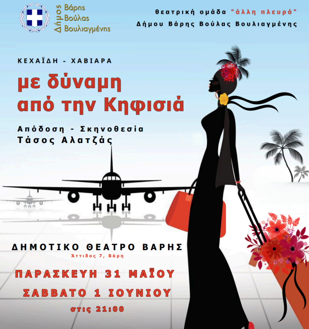 Η θεατρική ομάδα «άλλη πλευρά» του Δήμου Βάρης Βούλας Βουλιαγμένης παρουσιάζει το έργο των Δημήτρη Κεχαΐδη και Ελένης Χαβιαρά, «Με Δύναμη από την Κηφισιά» την Παρασκευή 31 Μαΐου και το Σάββατο 1 Ιουνίου στις 21:00, στο Δημοτικό Θέατρο Βάρης. Η απόδοση και σκηνοθεσία είναι του ηθοποιού και σκηνοθέτη Τάσου Αλατζά.