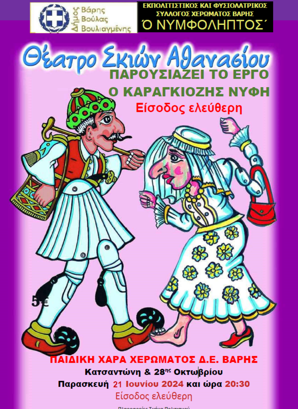 Ο Δήμος Βάρης Βούλας Βουλιαγμένης και ο Εκπολιτιστικός και Φυσιολατρικός Σύλλογος Χερώματος Βάρης «O ΝΥΜΦΟΛΗΠΤΟΣ», συνδιοργανώνουν την Παρασκευή 21 Ιουνίου 2024 στις 20:30, παράσταση με το Θέατρο Σκιών του Γιώργου Αθανασίου στο έργο «Ο Καραγκιόζης νύφη» στην παιδική χαρά του Χερώματος (οδός 28ης Οκτωβρίου και Κατσαντώνη).