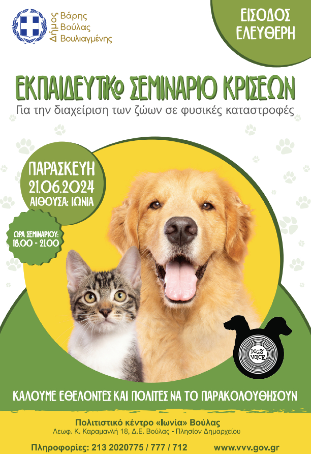 Για τον λόγο αυτό, σας προσκαλούμε την Παρασκευή 21 Ιουνίου και ώρα 18:00-21:00 μ.μ., στο Πολιτιστικό Κέντρο «ΙΩΝΙΑ» όπου σε συνεργασία με την Dogs’Voice, διοργανώνεται Εκπαιδευτικό Σεμινάριο Κρίσης, για την διαχείριση των ζώων σε φυσικές καταστροφές.