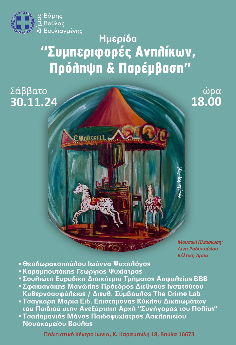 Ο Δήμος Βάρης Βούλας Βουλιαγμένης σας προσκαλεί, το Σάββατο 30 Νοεμβρίου 2024, ώρα 18.00 στο Πολιτιστικό Κέντρο Ιωνία, σε ημερίδα με θέμα «Συμπεριφορές Ανηλίκων Πρόληψη και Παρέμβαση».
