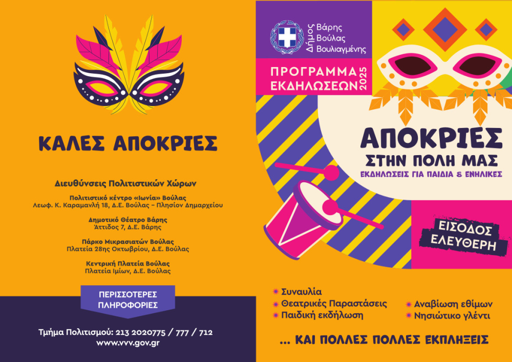 Ο Δήμος Βάρης Βούλας Βουλιαγμένης παρουσιάζει μια σειρά αποκριάτικων εκδηλώσεων για παιδικό και ενήλικο κοινό. Το πρόγραμμα περιλαμβάνει συναυλία, θεατρικές παραστάσεις για ενήλικες και παιδιά, αναβίωση αποκριάτικων εθίμων, δρώμενα, παραδοσιακό γλέντι με ζωντανή ορχήστρα και μια μέρα αφιερωμένη στους μικρούς μας φίλους αλλά και σε ολόκληρη την οικογένεια με διαδραστικά αποκριάτικα παιχνίδια, εικαστικά εργαστήρια, εργαστήρια κίνησης,face painting, παραδοσιακό γαϊτανάκι και το απίθανο έθιμο “σοκολατορίχτες”. Θα ακολουθήσουν διαγωνισμοί χορού, διαγωνισμοί κουστουμιού, ξυλοπόδαροι, αποκριάτικες κατασκευές, τοίχος αναρρίχησης και πολλές πολλές εκπλήξεις!