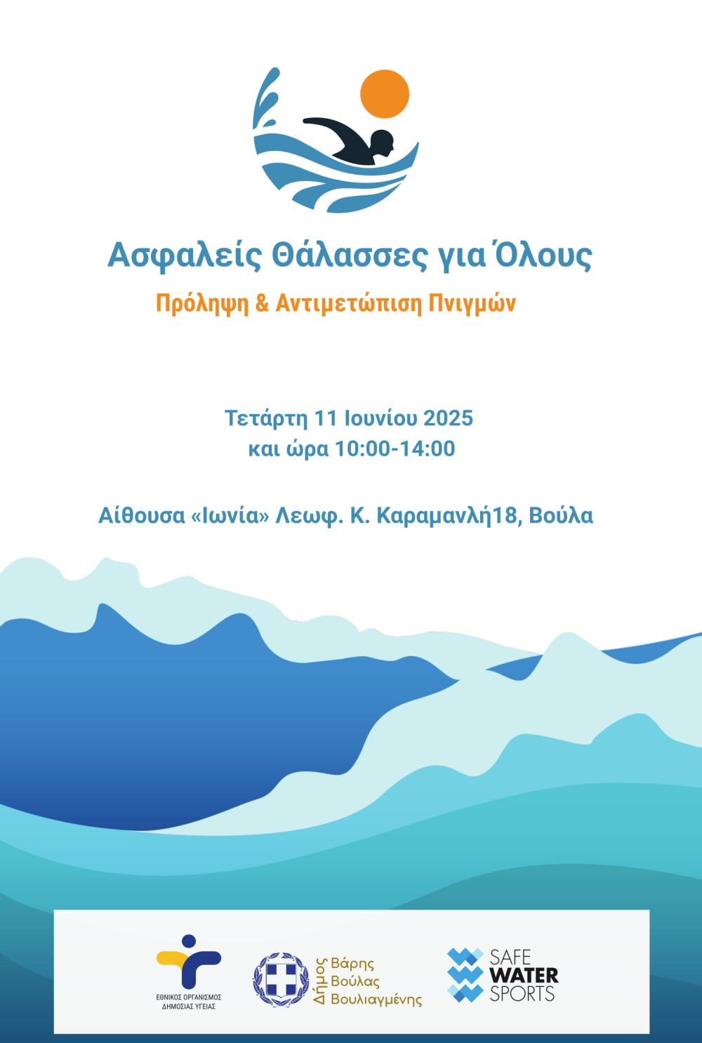 Ενημερωτική εκδήλωση για την πρόληψη των πνιγμών διοργανώνουν ο Δήμος Βάρης Βούλας Βουλιαγμένης, ο Εθνικός Οργανισμό Δημόσιας Υγείας και η οργάνωση Safe Water Sports, την Τετάρτη 11 Ιουνίου στις 10:00 π.μ. στο πολιτιστικό κέντρο «Ιωνία» (Λεωφ. Κ. Καραμανλή 18, Βούλα).