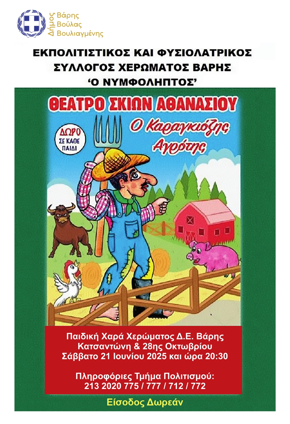 Ο Δήμος Βάρης Βούλας Βουλιαγμένης και ο Εκπολιτιστικός και Φυσιολατρικός Σύλλογος Χερώματος Βάρης «O ΝΥΜΦΟΛΗΠΤΟΣ» συνδιοργανώνουν παράσταση με το θέατρο σκιών του Γιώργου Αθανασίου στο έργο «Ο Καραγκιόζης αγρότης». Η παράσταση θ αλάβει χώρα το Σάββατο 21 Ιουνίου στις 20:30, στην παιδική χαρά Χερώματος επί της οδού 28ης Οκτωβρίου και Κατσαντώνη