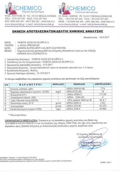 Σε όλες τις αναλύσεις ο Χημικός Μηχανικός που είχε την ευθύνη του ελέγχου, κ. Αναστάσιος Παγώνης, καταλήγει στο συμπέρασμα ότι «Σύμφωνα με τις παραπάνω χημικές αναλύσεις και βάσει της Η.Π 8600/416/Ε103/2009 ΚΥΣ και τις διατάξεις της οδηγίας 2006/7/ΕΚ, δεν έχει γίνει επιμόλυνση του παραπάνω προς εξέταση δείγματος με πετρελαιοειδή κατάλοιπα (μαζούτ, πετρέλαιο κλπ). Επιπροσθέτως, η μέτρηση για λίπη/ορυκτά έλαια έχει την ένδειξη Μ.Α. (μη ανιχνεύσιμο) και στα εφτά δείγματα.