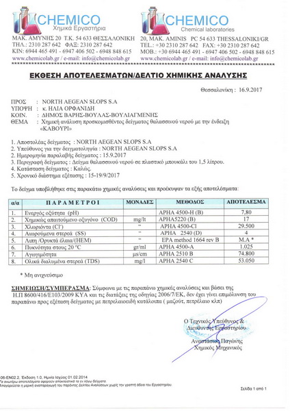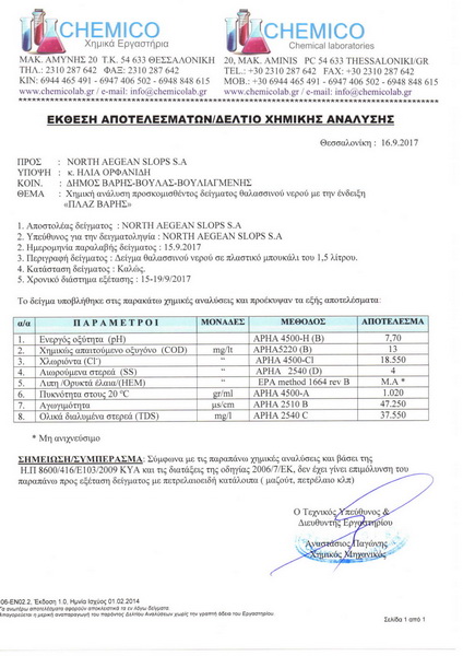 Δεν έχει γίνει επιμόλυνση με πετρελαιοειδή κατάλοιπα στη θάλασσα εντός των ορίων του Δήμου Βάρης Βούλας Βουλιαγμένης σύμφωνα με τον εργαστηριακό έλεγχο που παρήγγειλε ο Δήμο από τα χημικά εργαστήρια «Chemico»* με έδρα τη Θεσσαλονίκη. Ο συγκεκριμένος φορέας επιλέχθηκε με γνώμονα ότι διαθέτει εμπειρία από το 1986, με ειδίκευση στην ανάλυση πετρελαιοειδών και του ρύπους που προκαλούν, συνεργάζεται με πολλούς μεγάλους κρατικούς και ιδιωτικούς φορείς και διαθέτει όλες τις απαιτούμενες πιστοποιήσεις. Με δεδομένο ότι δεν βρέθηκε αντίστοιχος φορέας στην Αθήνα, ο οποίος να πληρεί τις απαιτούμενες προϋποθέσεις, αλλά παράλληλα να μπορέσει να ανταποκριθεί με την αμεσότητα που απαιτούσε η περίσταση, ο Δήμος επέλεξε να στείλει αεροπορικώς τα δείγματα στη Θεσσαλονίκη και να πάρει τα αποτελέσματα εντός ενός εικοσιτετραώρου.