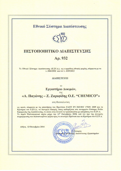 Η αρίστη επιστημονική κατάρτιση των χημικών και η επαγγελματική δραστηριότητα στο χώρο των χημικών αναλύσεων με εικοσαετή και πλέον εμπειρία, σε συνάρτηση με τον διακριβωμένο τεχνολογικά εξοπλισμό προσδίδουν στην CHEMICO φερεγγυότητα, εμπιστοσύνη και αξιοπιστία.