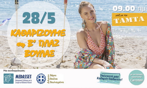 Σε εθελοντικό καθαρισμό της Β’ πλαζ Βούλας, πριν παραδοθεί με ελεύθερη πρόσβαση στο κοινό μας καλούν την Κυριακή 28 Μαΐου και ώρα 09.00 πμ, το MEDASSET, ο Δήμος Βάρης Βούλας Βουλιαγμένης και η αγαπημένη τραγουδίστρια Τάμτα, πρέσβειρα της εκστρατείας «Υπόσχεσή μας: Καθαρές Θάλασσες».