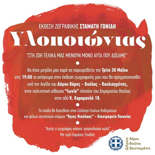 Την πρώτη του προσωπική έκθεση ζωγραφικής με τίτλο «ΥΛΟΠΟΙΩΝΤΑΣ» θα παρουσιάσει ο γνωστός τραγουδιστής Σταμάτης Γονίδης στην αίθουσα «Ιωνία» (Λεωφ. Κ. Καραμανλή 18, Βούλα) την Τρίτη 30 Μαΐου στις 19.00.