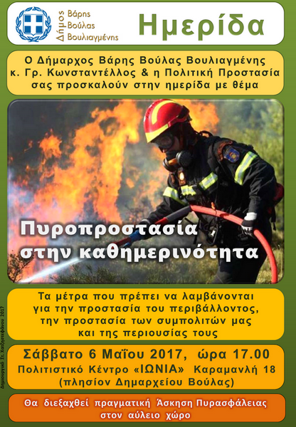 Ημερίδα με θέμα: «Πυροπροστασία στην καθημερινότητα» διοργανώνει ο Δήμος Βάρης Βούλας Βουλιαγμένης και το τμήμα Πολιτικής Προστασίας του Δήμου, το Σάββατο 6 Μαΐου στις 17.00 στο πολιτιστικό κέντρο «Ιωνία», Λεωφ. Κ. Καραμανλή 18, Βούλα.