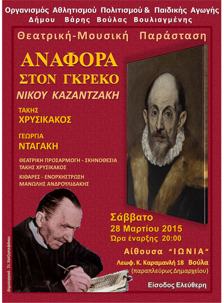 Ο Οργανισμός Αθλητισμού Πολιτισμού και Παιδικής Αγωγής του Δήμου Βάρης, Βούλας, Βουλιαγμένης (ΟΑΠΠΑ) σας προσκαλεί σε μία ξεχωριστή μουσικοθεατρική παράσταση, το Σάββατο 28 Μαρτίου 2015, στο Πολιτιστικό Κέντρο «ΙΩΝΙΑ», στη Βούλα( Καραμανλή 18 – παραπλεύρως Δημαρχείου). Η «Αναφορά στον Γκρέκο» είναι μια παράσταση εξαιρετικά ενδιαφέρουσα καθώς είναι η μυθιστορηματική αυτοβιογραφία του συγγραφέα που δεν πρόλαβε να τελειώσει λόγω του θανάτου του.