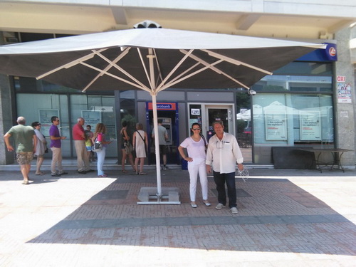 Μεγάλες ομπρέλες σκίασης τοποθετήθηκαν σήμερα στα προαύλια των τραπεζών «Alpha Bank», και «Eurobank» στην κεντρική πλατεία της Βούλας για να διευκολύνεται η αναμονή των συμπολιτών μας, και κυρίως των συνταξιούχων στις ουρές που σχηματίζονται στα ATM.