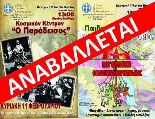 Αναβάλλονται οι προγραμματισμένες, για την Κυριακή 11 Φεβρουαρίου, Αποκριάτικες εκδηλώσεις του Δήμου Βάρης Βούλας Βουλιαγμένης στην Πλατεία Ιμίων.
