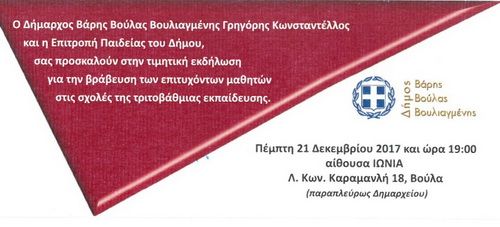 Ο Δήμαρχος Βάρης Βούλας Βουλιαγμένης, Γρηγόρης Κωνσταντέλλος, και η Δημοτική Επιτροπή Παιδείας σας προσκαλούν στην τιμητική εκδήλωση για τη βράβευση των επιτυχόντων μαθητών στις σχολές της τριτοβάθμιας εκπαίδευσης. Η βράβευση θα πραγματοποιηθεί την Πέμπτη 21 Δεκεμβρίου, στις 19.00, στην αίθουσα «Ιωνία» (Λεωφ. Κ. Καραμανλή 18, Βούλα).