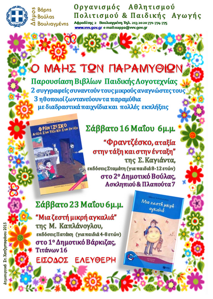 Ο Οργανισμός Αθλητισμού Πολιτισμού και Παιδικής Αγωγής (Ο.Α.Π.Π.Α.) του Δήμου Βάρης Βούλας Βουλιαγμένης, διοργανώνει στις 16 και 23 Μαΐου, στις 18:00 «ΤΟΝ ΜΑΗ ΤΩΝ ΠΑΡΑΜΥΘΙΩΝ» με 2 συγγραφείς, 3 ηθοποιούς, διαδραστικά παιχνίδια και άλλες πολλές εκπλήξεις.