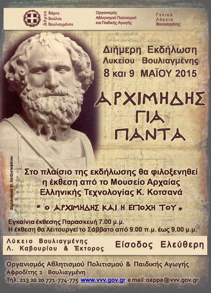 To Δ.Σ του Οργανισμού Αθλητισμού Πολιτισμού και Παιδικής Αγωγής, του Δήμου Βάρης - Βούλας - Βουλιαγμένης, σε συνεργασία με τον Σύλλογο καθηγητών του Λυκείου Βουλιαγμένης, προσκαλούν όλους τους δημότες και επισκέπτες των τριών πόλεων, να παρακολουθήσουν τη διήμερη εκδήλωση του Λυκείου Βουλιαγμένης, στις 8,9 Μαϊου, με τίτλο «Αρχιμήδης για πάντα», στον χώρο του σχολείου.