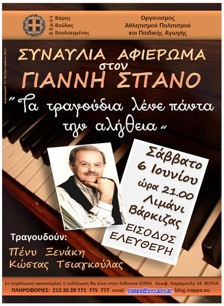 Ο Οργανισμός Αθλητισμού Πολιτισμού και Παιδικής Αγωγής του Δήμου Βάρης Βούλας Βουλιαγμένης, (ΟΑΠΠΑ), οργανώνει συναυλία αφιέρωμα στον Γιάννη Σπανό, με τίτλο «Τα τραγούδια λένε πάντα την αλήθεια». Η συναυλία θα πραγματοποιηθεί το Σάββατο 6 Ιουνίου και ώρα 21:00 στην πλατεία της Βάρκιζας. Η είσοδος θα είναι ελεύθερη για το κοινό.