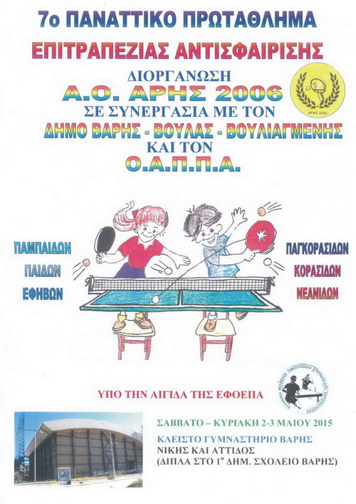 Ο Αθλητικός Όμιλος «ΑΡΗΣ 2006», σε συνεργασία με τον Οργανισμό Αθλητισμού Πολιτισμού και Παιδικής Αγωγής (ΟΑΠΠΑ) του Δήμου Βάρης Βούλας Βουλιαγμένης και την Ελληνική Φίλαθλη Ομοσπονδία Επιτραπέζιας Αντισφαίρισης, διοργανώνουν το 7ο Παναττικό Πρωτάθλημα Ατομικών Αγωνισμάτων Παμπαίδων, Παγκορασίδων, Παίδων-Κορασίδων, Εφήβων-Νεανίδων.