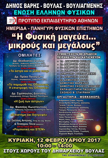 Ο Δήμος Βάρης- Βούλας- Βουλιαγμένης, η Ένωση Ελλήνων Φυσικών και το Πρότυπο Εκπαιδευτήριο Αθηνών σάς προσκαλούν στην ημερίδα - πανηγύρι Φυσικών Επιστημών που θα πραγματοποιηθεί την Κυριακή, 12 Φεβρουαρίου 2017, στους χώρους του Δημαρχείου Βούλας (10:00-14:00). Η αυλαία της εκδήλωσης θα ανοίξει με τους χαιρετισμούς των επίσημων προσκεκλημένων και θα ακολουθήσουν ομιλίες διακεκριμένων επιστημόνων από το χώρο των θετικών επιστημών.