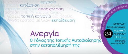 Δυναμική παρέμβαση σε θέματα αντιμετώπισης της ανεργίας κάνει την Κυριακή, 24 Απριλίου, ο Δήμος Βάρης Βούλας Βουλιαγμένης, με τη διοργάνωση εκδήλωσης με θέμα «Ανεργία: Ο Ρόλος της Τοπικής Αυτοδιοίκησης στην καταπολέμηση της». Η εκδήλωση πραγματοποιείται στο πλαίσιο του πολυσυνεδρίου, «Blue Money Show» που πραγματοποιείται στον Αστέρα Βουλιαγμένης, με συνδιοργανωτή τον Δήμο. Οι ομιλητές θα παρουσιάσουν τις δράσεις του Δήμου Βάρης Βούλας Βουλιαγμένης στην κατεύθυνση της καταπολέμησης της ανεργίας.