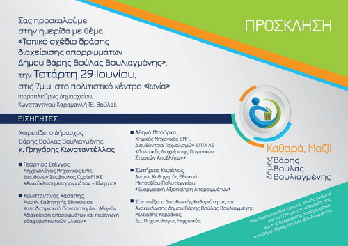 Τι νέες καινοτόμες πολιτικές του στον τομέα της διαχείρισης απορριμμάτων παρουσιάζει ο Δήμος Βάρης Βούλας Βουλιαγμένης σε ειδική ημερίδα την ερχόμενη Τετάρτη 29 Ιουνίου, στις 19.00 στο πολιτιστικό κέντρο «Ιωνία» (Λεωφ. Κ. Καραμανλή 18, Βούλα).