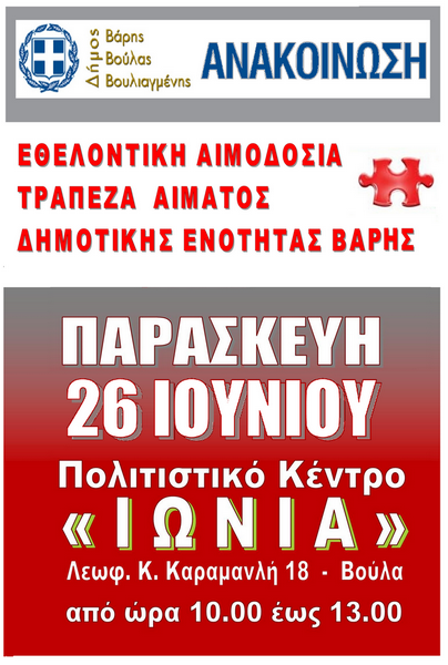 Εθελοντική αιμοδοσία διοργανώνει η κοινωνική υπηρεσία του Δήμου Βάρης Βούλας Βουλιαγμένης την Παρασκευή 26 Ιουνίου. Η αιμοδοσία θα πραγματοποιηθεί στην αίθουσα Ιωνία (Λεωφ. Κ. Καραμανλή 18, Βούλα) από τις 10 π.μ. έως τη 1 μ.μ.