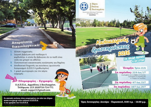 Μετά τη μεγάλη επιτυχία που σημείωσαν οι καλοκαιρινές αθλητικές δραστηριότητες για παιδιά που πραγματοποίησε ο Δήμος Βάρης Βούλας Βουλιαγμένης το 2015, μέσω του Οργανισμού Αθλητισμού, Πολιτισμού και Παιδικής Αγωγής (ΟΑΠΠΑ), αποφασίστηκε η διοργάνωση νέων δραστηριοτήτων και για το καλοκαίρι του 2016. Οι «Καλοκαιρινές Αθλητικές και Δημιουργικές Δραστηριότητες 2016», απευθύνονται σε παιδιά 6 έως 14 ετώνκαι θα πραγματοποιηθούν στις εγκαταστάσεις του «Δημοτικού Αθλητικού Κέντρου Βουλιαγμένης» (Αγίου Γεωργίου 2, Καβούρι) σε τρεις περιόδους: